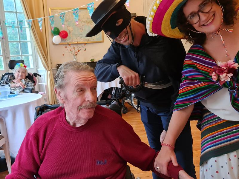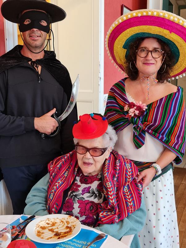 Jeudi dernier, dans le cadre des repas à thème de chaque mois, nous avons voyagé au Mexique. Toute la résidence a adopté les couleurs de L'Amérique Centrale. Les résidents ont beaucoup participé à la préparation des décorations de tables et des coiffes ( sombreros et bandeaux de fleurs) portés par nous tous en cette journée festive.
